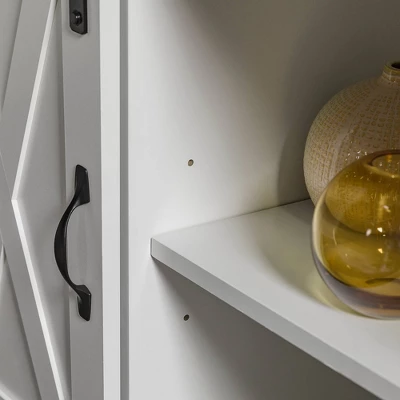 Make an on-trend statement in your home with this stylish 52-inch TV stand from Saracina Home. In a modern farmhouse aesthetic, this design style is everything, with barn door inspired cabinets and metal accents. In a multi-functional design, this console can also be used as a storage cabinet in your bedroom or buffet table in your kitchen. The sliding cabinet doors cover up the side or center shelving, with two open shelves above perfect for electronics. Keep your media, books, dĂŠcor, and more on the adjustable shelving. Made of high-grade MDF, durable laminate, and metal. Can fit up to a 58-inch TV.